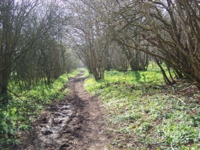 Soon the track passes through Dole's Hill Plantation. The woods here are typical of this part of the world. Hazel formerly was coppiced, cut back to the stool so that the tree threw up straight shoots which could be woven into sheep hurdles. Barbed wire and electric fencing have brought an end to the trade, but the woods still retain their distinctive appearance.